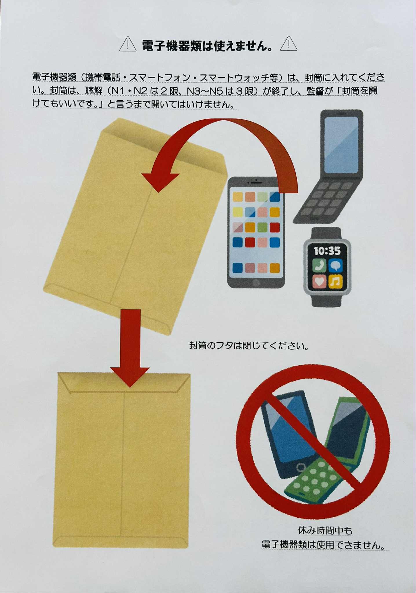 携帯電話、スマートフォン、スマートウォッチなどの電子機器の持ち込みは禁止されています。必ず電源を切って、指定のバッグ(封筒)に入れ、試験委員の許可があるまで絶対に使用・開封しないでください。
