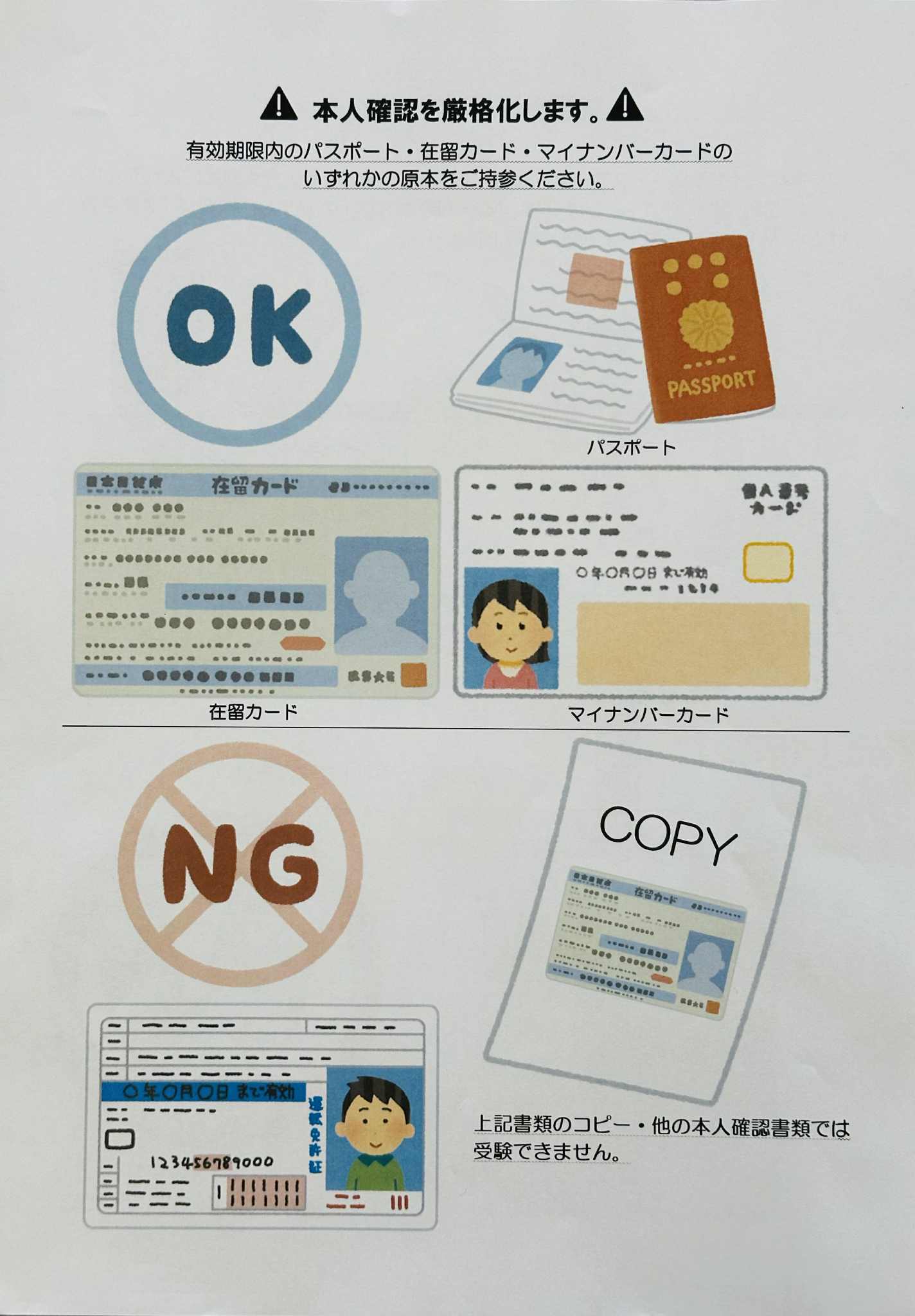・試験当日は、パスポート、在留カード、マイナンバーカードのいずれかの原本を忘れずにご持参ください。
